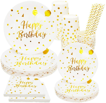 Shunli सफेद और सोने पार्टी की आपूर्ति डिस्पोजेबल बर्तन सेट कागज रात के खाने के/मिठाई प्लेटें पट्टियां कप जन्मदिन शादी के लिए